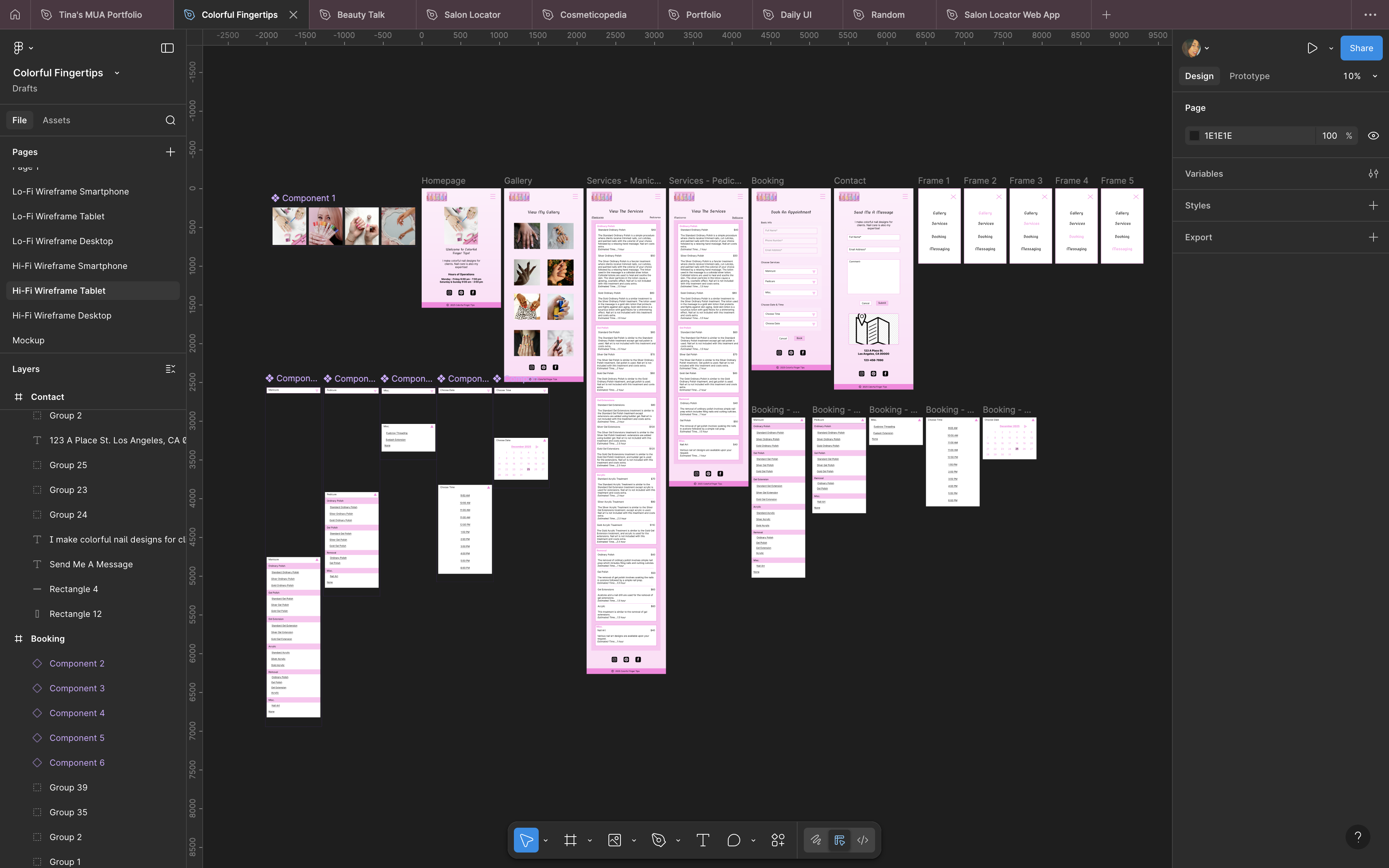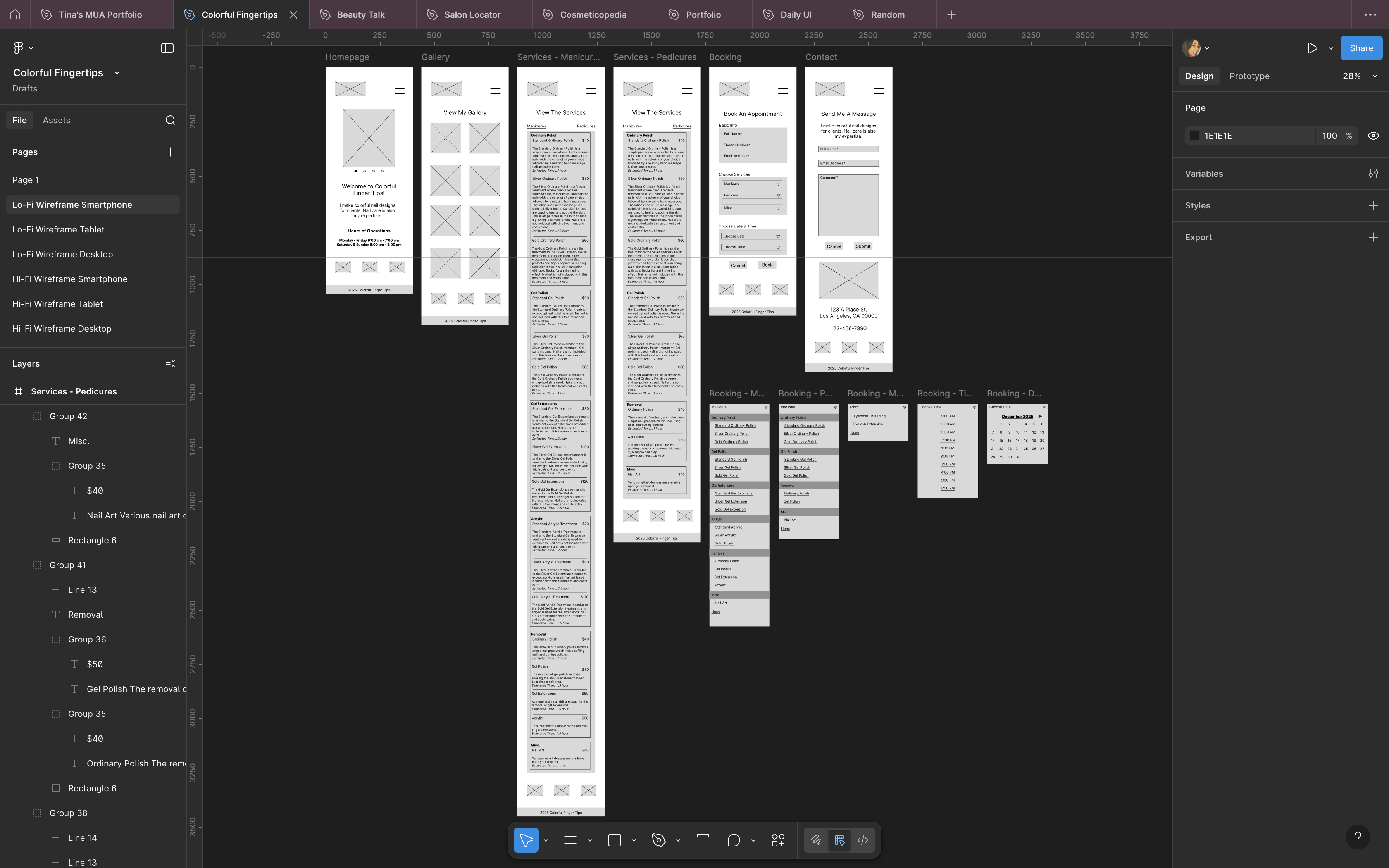 The low-fidelity wire framing begins once I have completed the sketches. Figma is the tool that I used to further organize the layout for Colorful Finger Tips. I did have to make several changes to my sketches and as a result, I made adjustments to the low-fidelity wireframes. The wireframes for smartphones, tablets, and computers are designed so that Ashley's clients can access the site from anywhere.